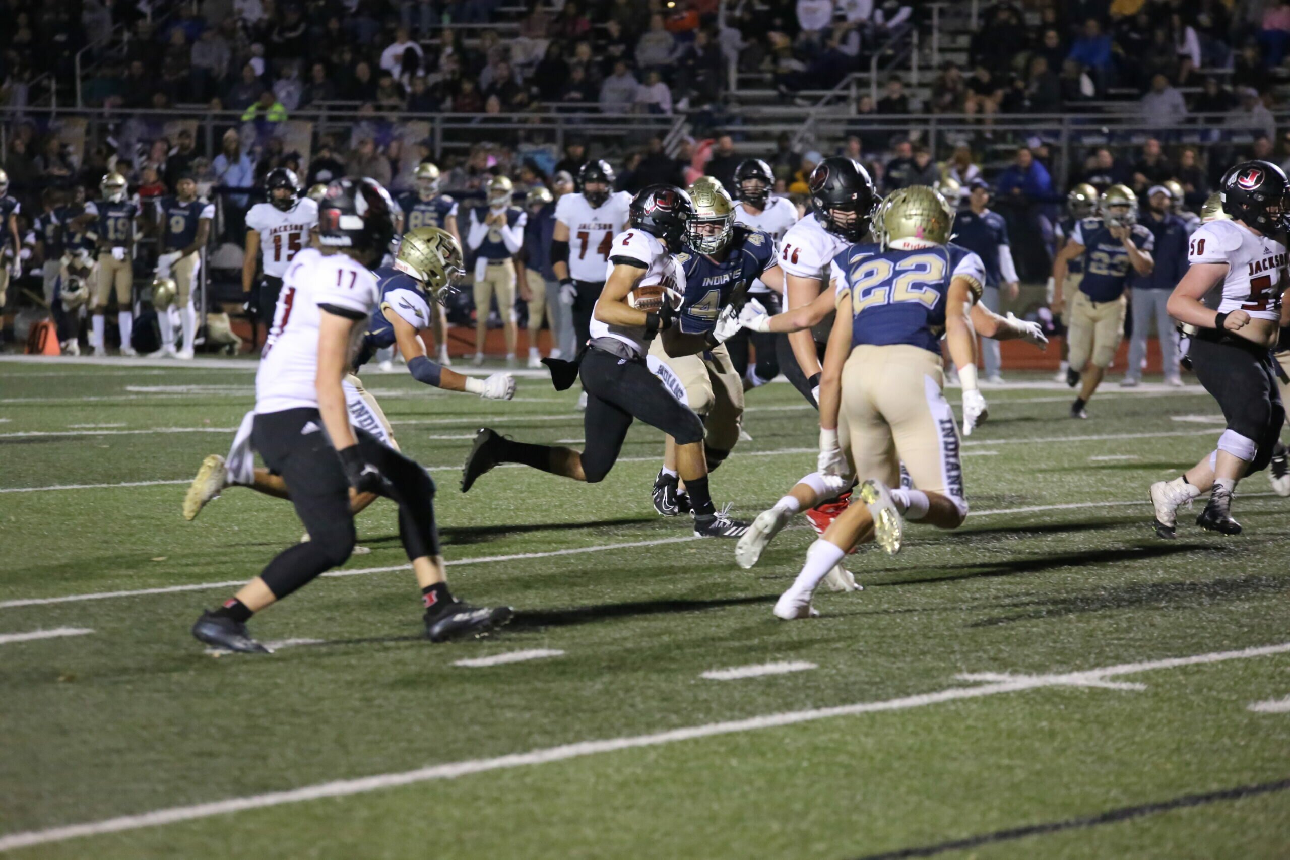 Thankfully, they had another drive left in them before the half came to a close. After marching down the field to the 24 yard line, the Indians decided to go for it on 4th-and-17 and QB Adrian Fox hooked up with Kai Crowe on a nifty pass into the end zone. The two-point conversion from Fox to Isaiah Davis cut the lead to 21-14 and gave Jackson some life heading into the locker room.